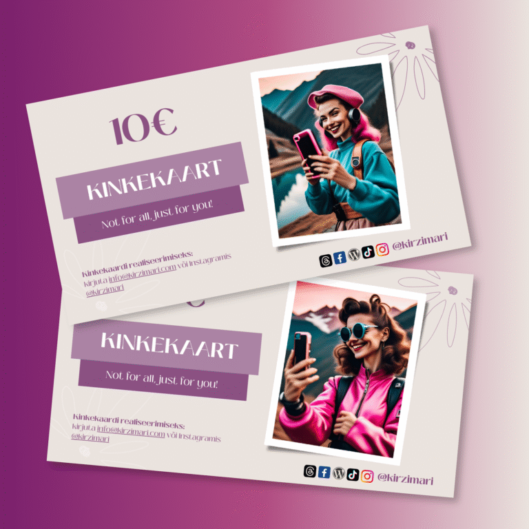 ✔️ Kinkekaarti on allalaetav PDF failina, kuid võimalik on ka saada prinditud kujul – selleks kirjuta info@kirzimari.com või Instagramis @kirzimari
